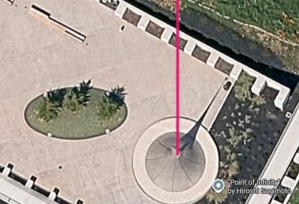 The red line in the above photo from Google maps shows the 360 degree angle of the shadow of the sun on the summer solstice 6/22/25, at solar noon at 1:11 PDT, about 20 feet to the right of the small granite marker. The google map photo was apparently taken just before 2:30 P.M. PDT. NOAA.